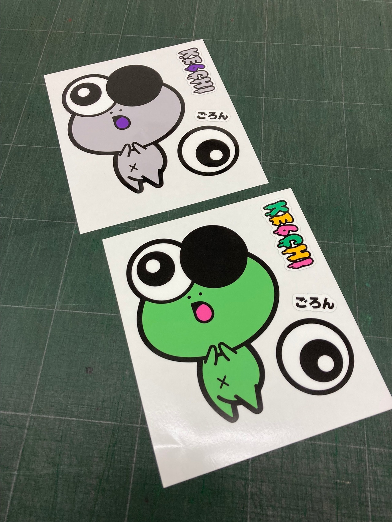 カエル、目玉、文字、ロゴ4箇所にハーフカットが入っていますので、