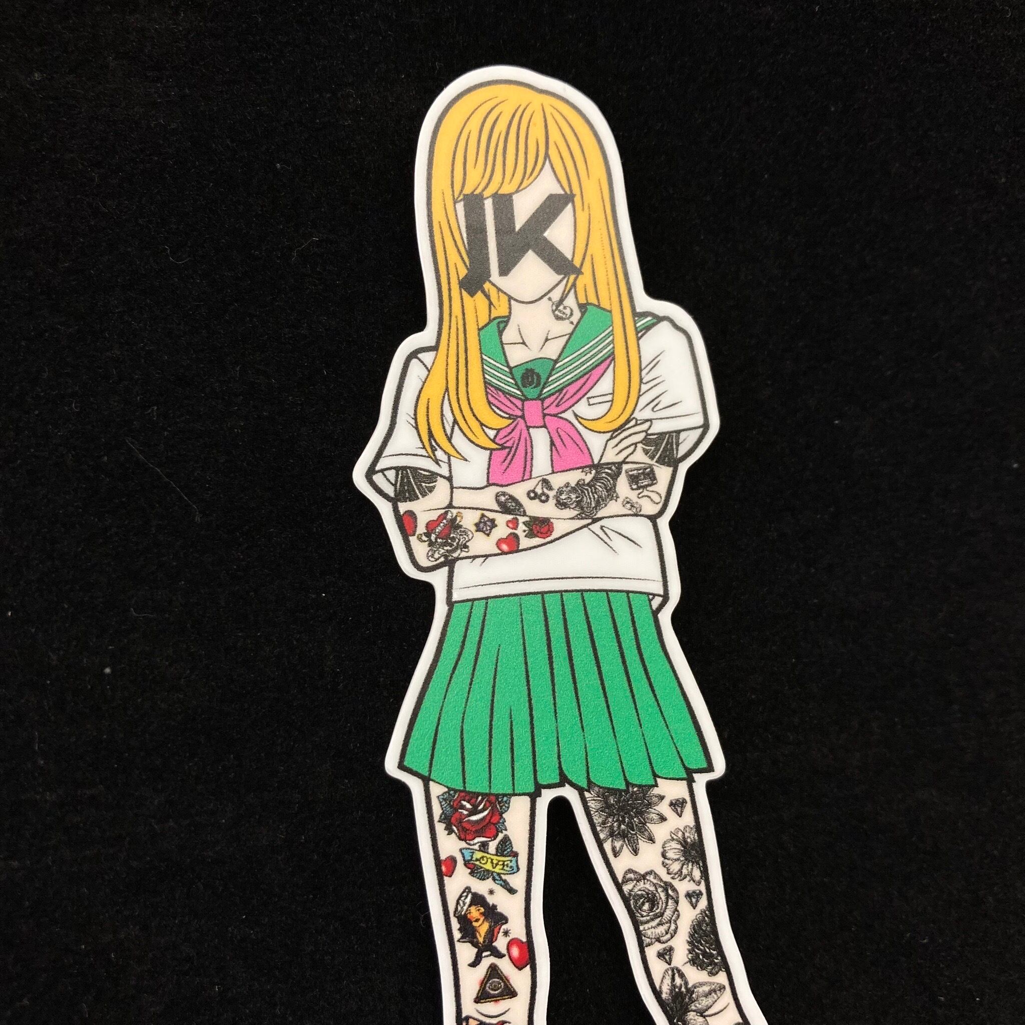 腕組みをしているMJKのダイカットステッカーです。